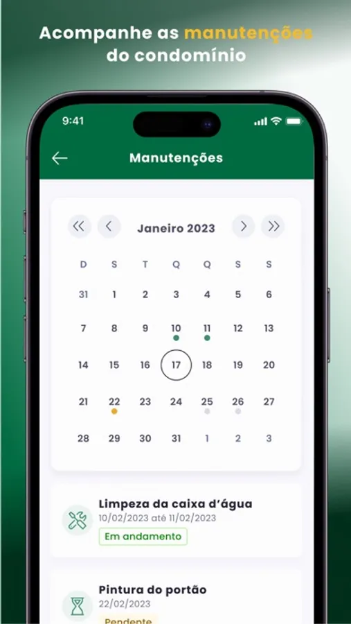 • MANUTENÇÕES: Fique por dentro das manutenções e limpezas do seu condomínio. Assim você pode se programar com mais antecedência e ficar por dentro de tudo que acontece!
