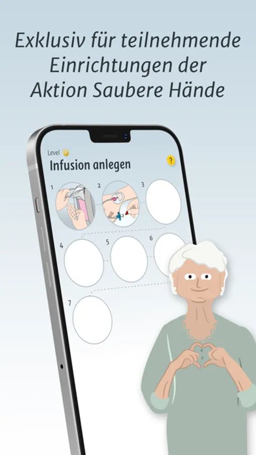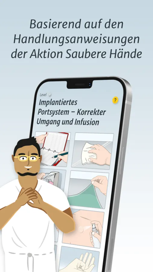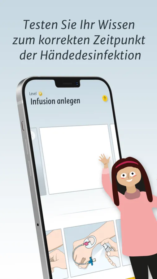 Spielen Sie sich durch 13 verschiedene Level basierend auf den Handlungsanweisungen der Aktion Saubere Hände. Jedes Level lässt sich in wenigen Minuten durchspielen und kann jederzeit wiederholt werden, um Ihr Wissen aufzufrischen. Neue Handlungsanweisungen werden schrittweise ergänzt.