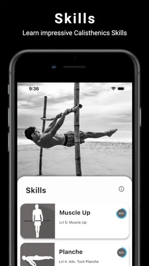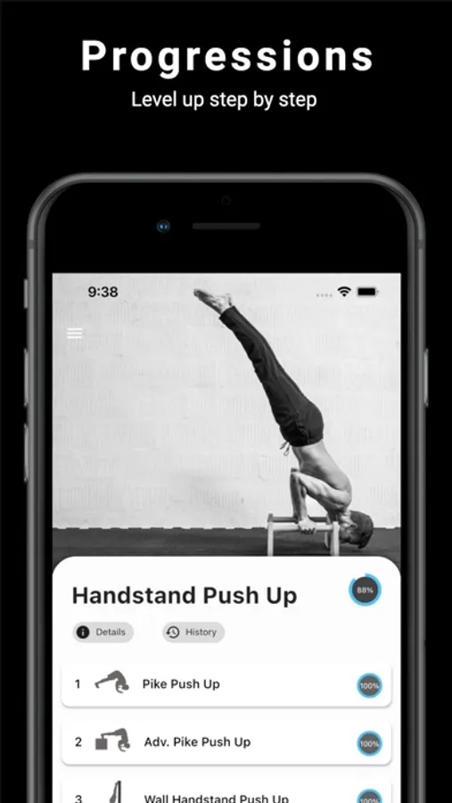 Thenics will guide you with descriptions and technique explanation of the skills and progressions. Every skill is divided into several progressions which include different workouts. Thereby you are able to learn skills step by step adapted to your current level.