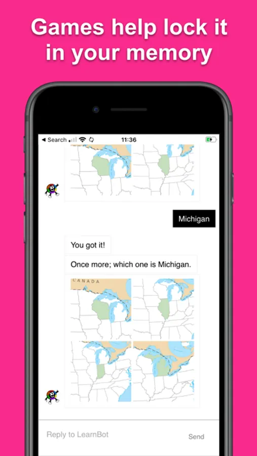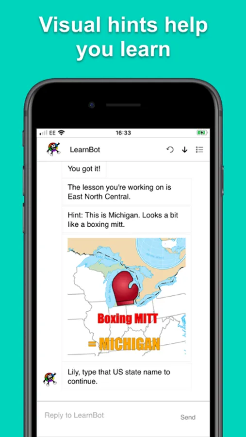 - A chatbot will personally tutor you, giving you visual learning hints that will stay with you (examples in the screenshots).