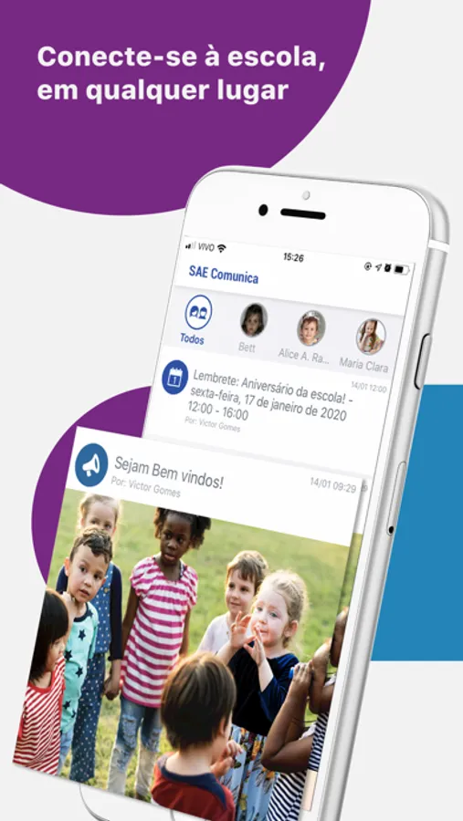 Com este aplicativo, os pais, responsáveis e professores poderão receber as últimas informações da escola, as notícias do dia a dia do seus filhos e o calendário de atividades escolares.