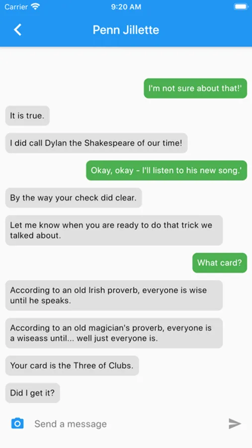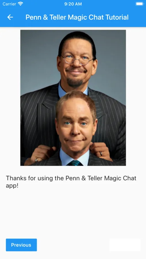 This App is a tool for fooling your friends into thinking they're texting directly to Penn or Teller, who answer with smart-aleck remarks and the punch line to an amazing magic trick. It works 24 hours a day with different replies (and different levels of courtesy) depending on the time of day or mood you find Penn or Teller in.