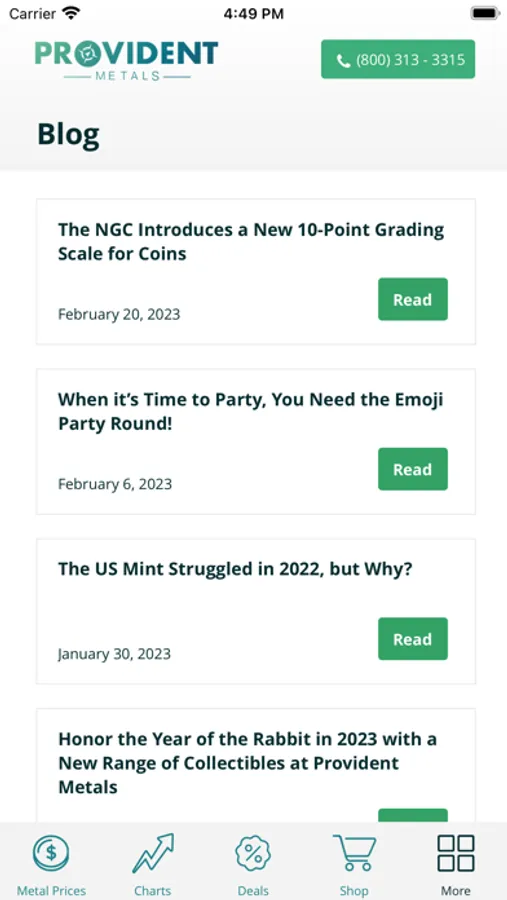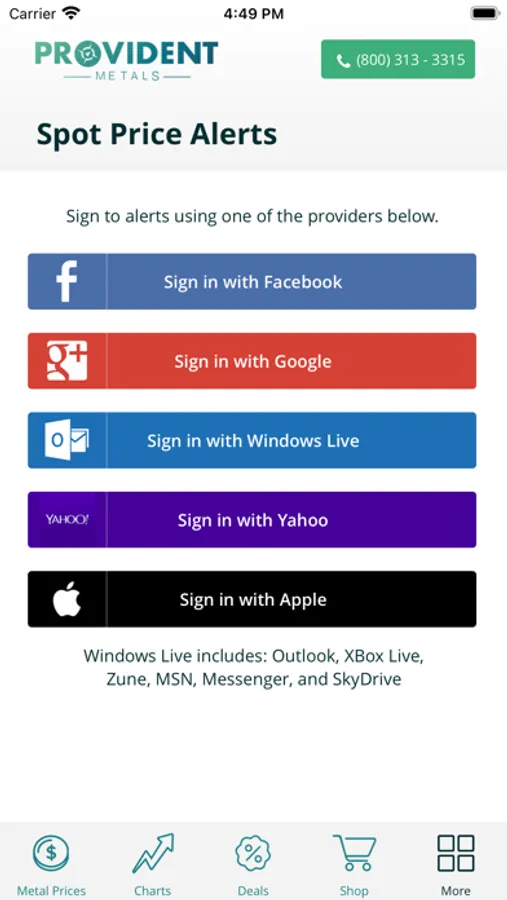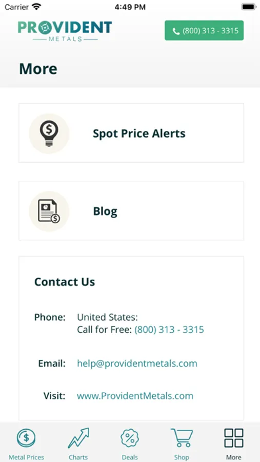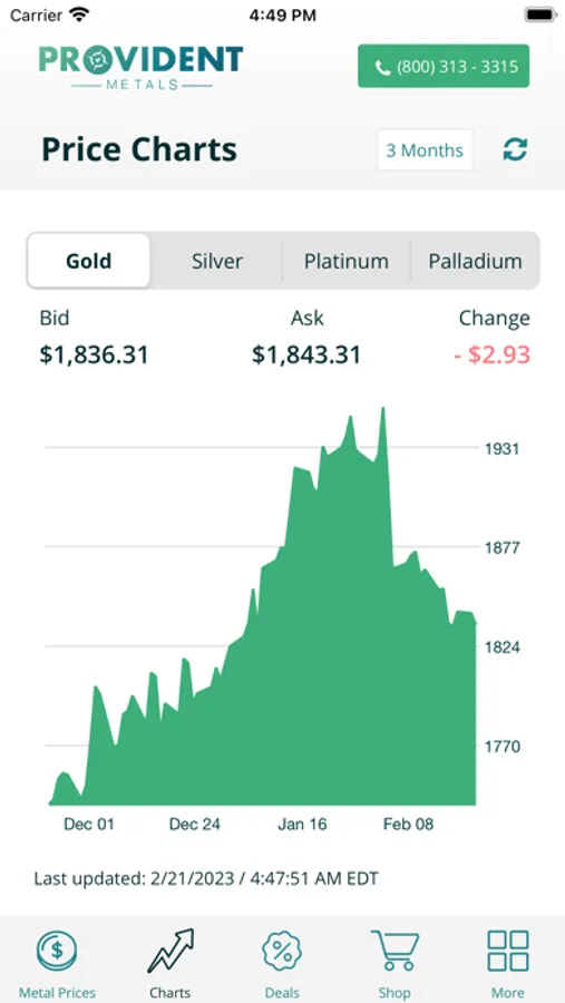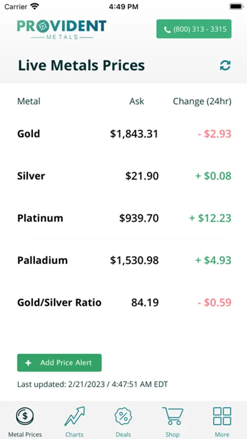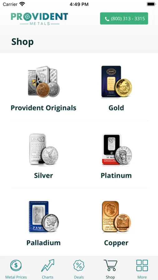 The Provident Metals app offers up to the minute gold, silver, platinum, and palladium prices. Stay in tune with markets using our interactive precious metals charts, and set custom spot price alerts to receive text and/or email messages when the gold price or silver price hits your target level. Browse the Provident Metals specials tab, offering our best deals on gold and silver bullion shipped directly to your door.