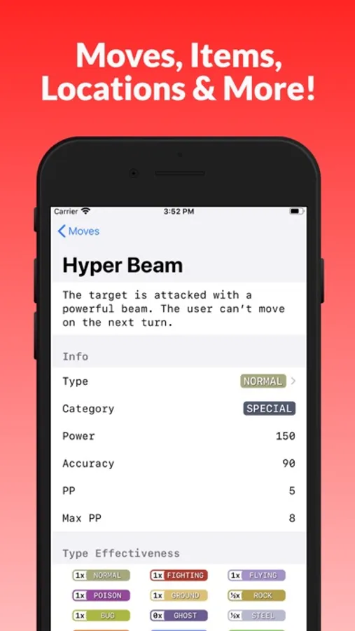 Never before seen in any other app, select the Pokémon you're fighting against and its level, and view compiled tactical information in a streamlined interface. No more looking through multiple pages to figure out how to fight it!