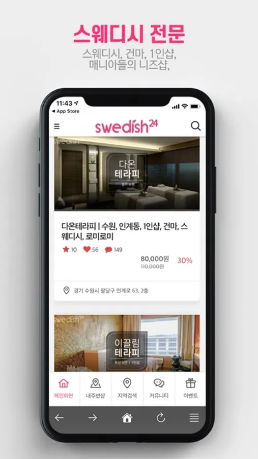 저희 스웨디시 24는 마사지, 스웨디시마사지, 중국마사지, 커플마사지, 타이마사지, 로미로미, 1인샵, 출장마사지 등 전국 마사지샵의 정보를 전국 최저가로 제공하며 최고의 힐링을 선사합니다.