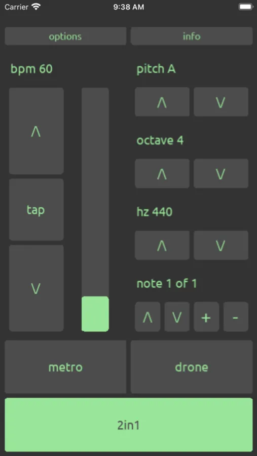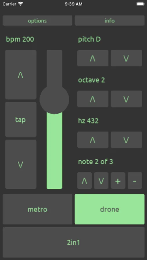 2in1 Drone Metronome is what you get when you combine a metronome and drone into one tool. metro.drone has three different modes-- metronome mode which works like a conventional metronome, drone mode which works like a conventional drone, and metro.drone mode. metro.drone mode puts the pitch of the drone to the beat of the metronome, and hence the true power of 2in1 Drone Metronome is unleashed.