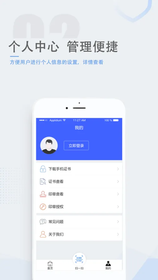 用户根据引导可直接通过人脸识别功能获取证书,使用“扫一扫”功能,即可实现移动+WEB应用的电子认证功能。