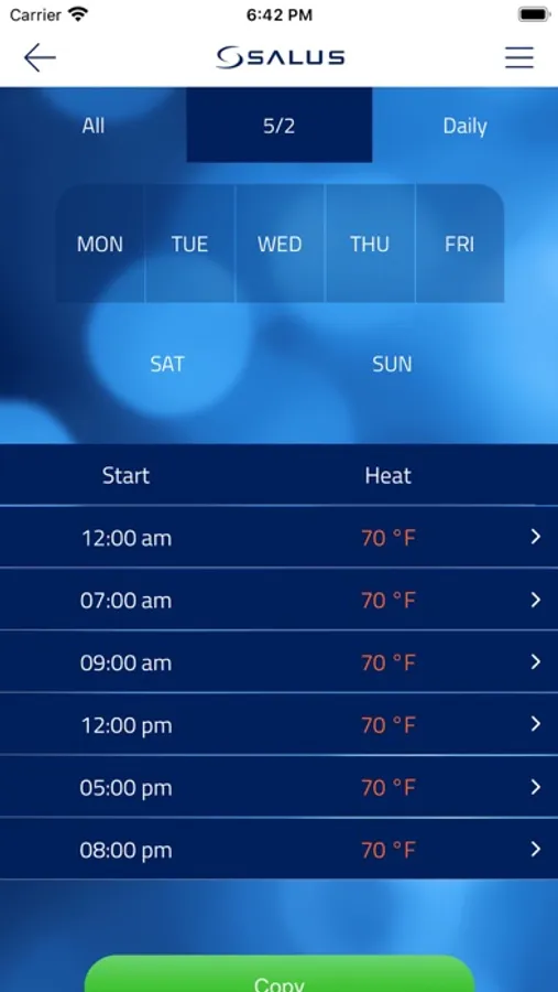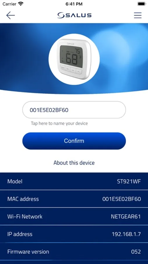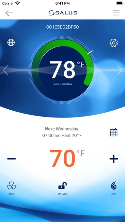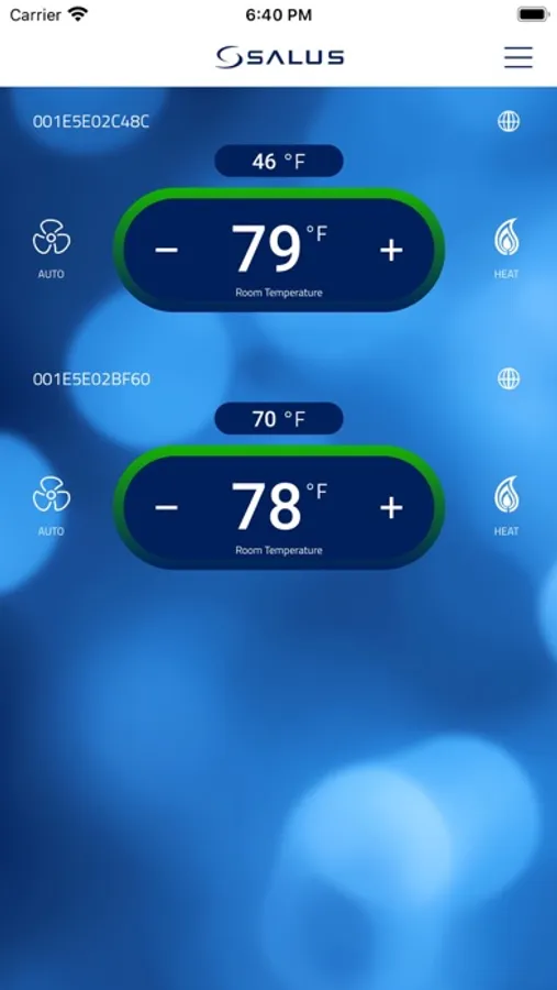 The SALUS SOLO app provides a clean interface with intuitive navigation to allow users to monitor and control the HVAC systems from any iOS mobile device. The App provides a simple and efficient view of the run-time status of multiple SOLO thermostats installed on you home WIFI network. One touch allows you to drill-down into any thermostat to view the operational status of your HVAC equipment, control the set-point temperature, heating and cooling mode and fan state and schedules. A detailed settings menu allows users to access, and alter, many of the system parameters right from your mobile device. A convenient Bluetooth interface provides a fast and efficient means of connecting the thermostat to the local Wi-Fi network.