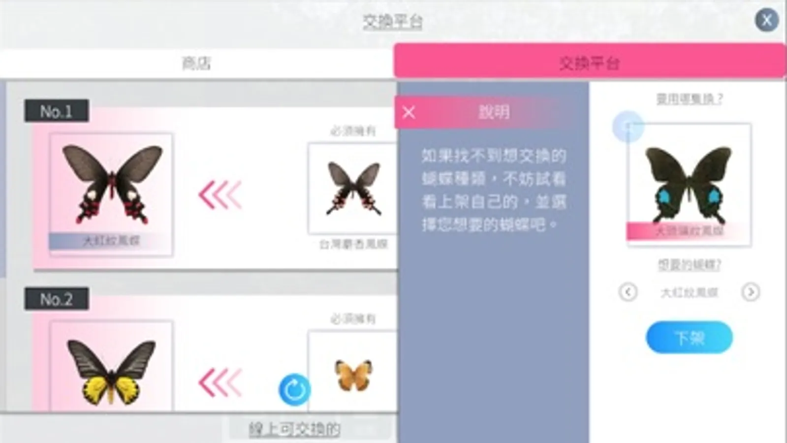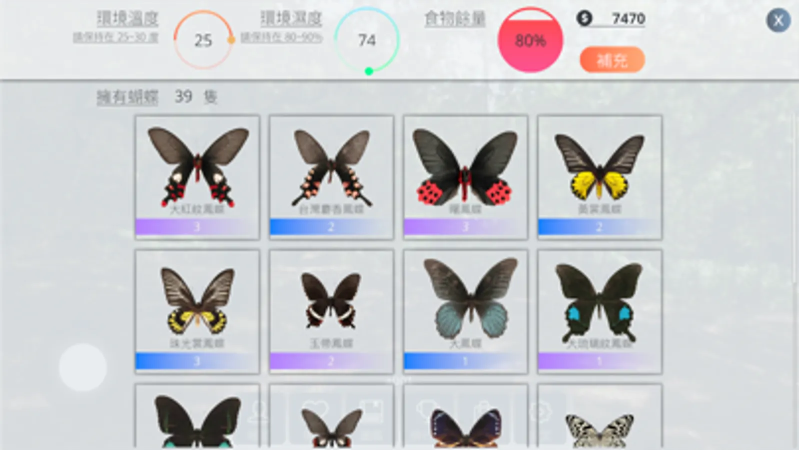 蝴蝶館收藏了 20 種台灣看得到的蝴蝶,請細心飼養、調節環境照顧他們,還可以和其他人交換蝴蝶喔 !,快來收集他們吧 !