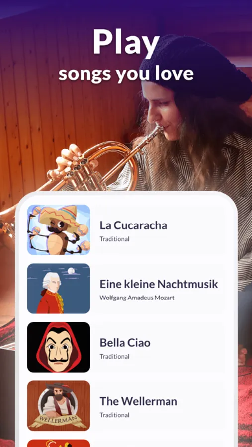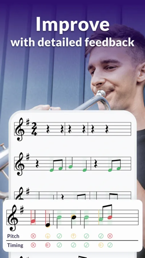 Weekly challenges with hand-picked songs give you the extra motivation to improve your skills when you compare yourself with trumpet players from around the world.