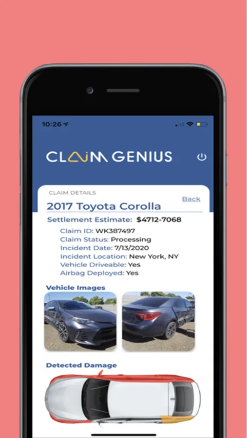 Using Claim Genius’s mobile app, customers involved in an auto accident simply take pictures of the vehicle’s damage, which are then uploaded and processed by our advanced AI models to generate a detailed vehicle repair estimate and total loss assessment within minutes. Insurance carriers can use this information to quickly finalize and settle a claim, greatly accelerating the process for end customers.