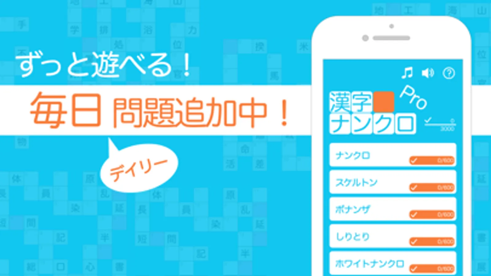 漢字パズルゲームは全5種類。雑誌でも人気の漢字ナンクロの他、スケルトン、ボナンザ、漢字しりとり、珍しいホワイトナンクロもあるよ。各パズルにつき6段階の難易度あり。