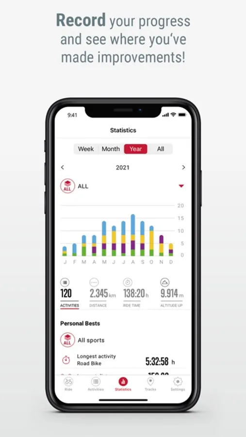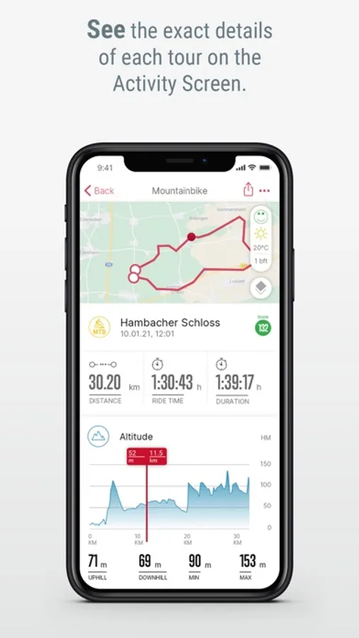 Record your progress and see where you have improved. Ride data such as speed can be displayed as a heat map. Various coloured fields provide a quick overview of your performance and make it easy to detect outlying values. You can also record weather data and your subjective perception of the ride.