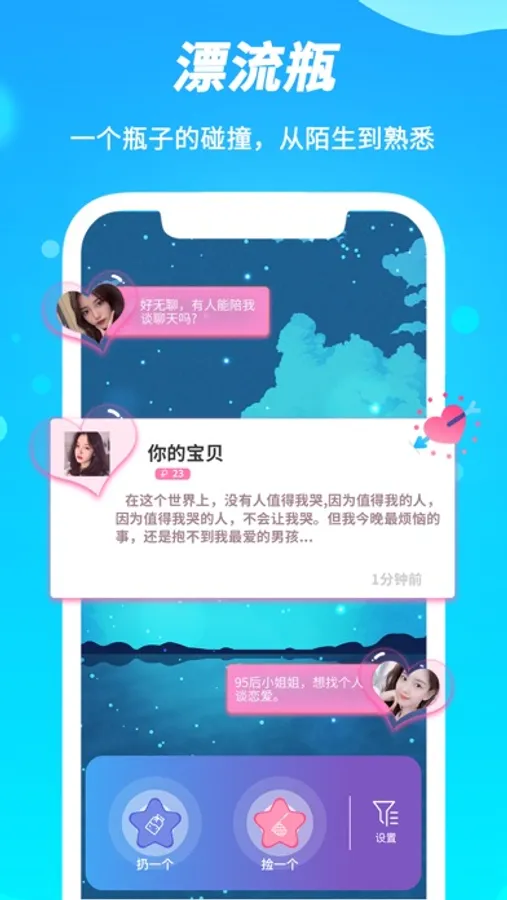 1.【漂流瓶】捞取自己喜欢的瓶子,即可开聊,让我们帮你找到可以共鸣的人,无压力的记录生活瞬间,让我们帮你晒给可能会懂你的人。