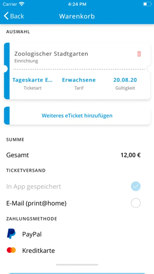 Die App eTicket KA ermöglicht es Ihnen, einfach und schnell per Smartphone oder Tablet digitale Eintrittskarten für Karlsruher Einrichtungen zu kaufen. Das Anstehen in Warteschlangen vor den Kassen hat damit ein Ende für Sie. Mit der App können sowohl normale Eintrittskarten für Erwachsene oder ermäßigte Karten für Senioren, Behinderte, Schüler, Kinder etc. als auch Eintrittskarten für Gruppen unterschiedlicher Art oder auch Jahreskarten erworben werden. eTicket@KA unterstützt die Bezahldienste VISA, Mastercard, giropay sowie PayPal. Durch Vorzeigen des für die digitale Eintrittskarte generierten QR-Codes an einem QR-Code Leser ist der Besuch der jeweiligen Einrichtung einfach und ohne weiteres Anstehen möglich.
