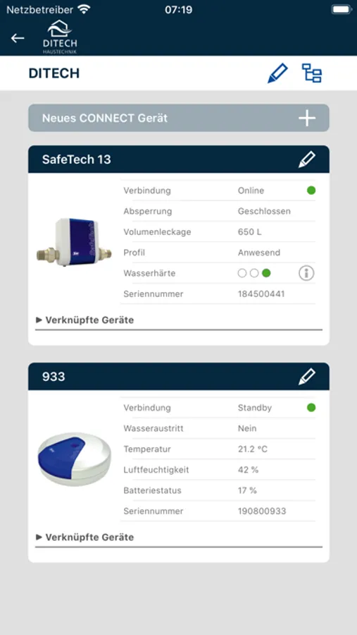 Die Sanitär-Union GmbH &  Co. KG bietet mit seiner Marke DITECH innovative Haustechnik an. Mit unserer kostenlosen App steht Ihnen die DITECH Geräte-Welt offen. Eine App für alle DITECH Geräte, Sicherheit für Ihre Hausinstallation inklusive Urlaubsfunktion. Sie können neue Armaturen hinzufügen, Projekte anlegen und alles online kontrollieren und steuern. Das System ist vernetzt, alle DITECH Geräte kommunizieren und interagieren. So meldet die Weichwasseranlage dem Leckageschutz, wenn sie Wasser für die Regeneration braucht. Sie haben alles im Blick: Salzvorrat – Eingangshärte – Ausgangshärte – Wasserdruck – Restkapazität in Liter – Statistiken wie Wasser- oder Salzverbrauch.