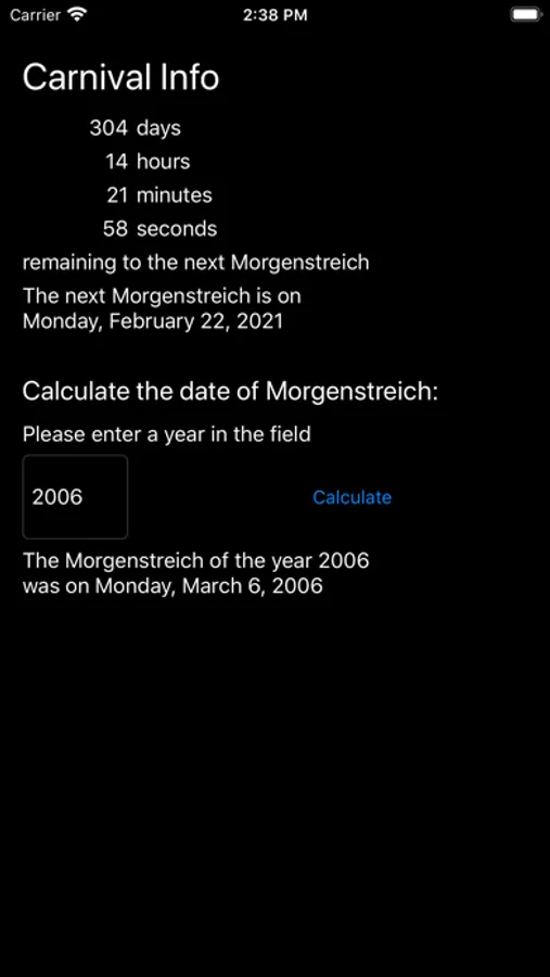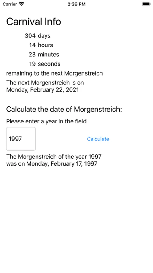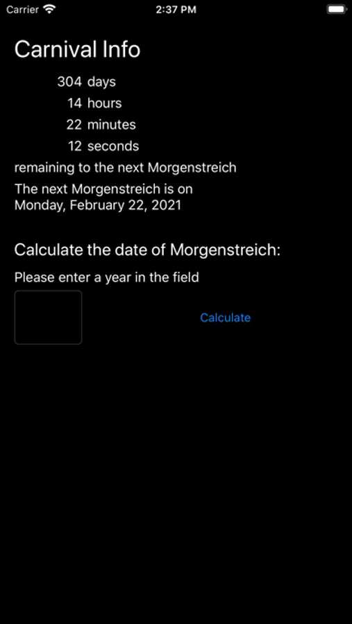 The application calculates the remaining time to the next Morgenstreich of the carnival in Basel Switzerland. In addition the date of the Morgenstreich, the beginning of the carnival in Basel can be calculated in a given year.