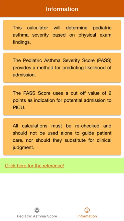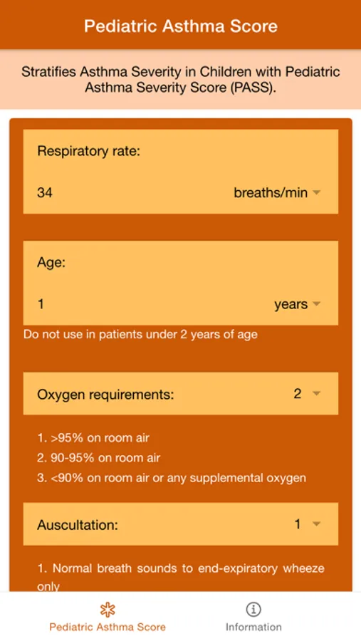 Disclaimer: all calculations must be re-checked and should not be used alone to guide patient care, nor should they substitute for clinical judgment. Calculations in this "Pediatric Asthma Severity Score - Asthma Tracker" app might be different with your local practice. Consult to expert doctor whenever necessary.