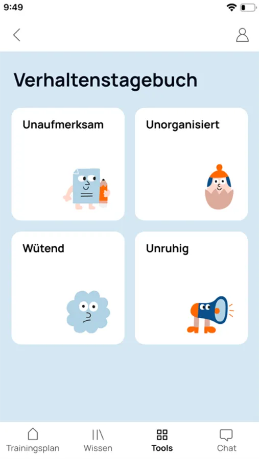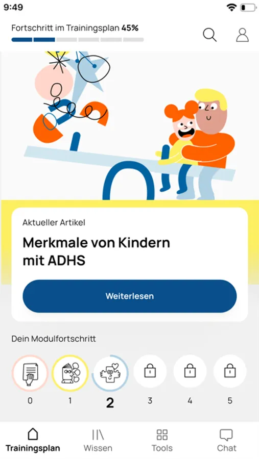 Ein Trainingsplan wird individuell, basierend auf den eigenen Problemstellungen und persönlichen Bedürfnissen, zusammengestellt. So werden Eltern Schritt für Schritt durch das Programm geleitet und bei der Umsetzung der Tipps aktiv unterstützt. Teil des Programms sind außerdem die folgenden Tools: