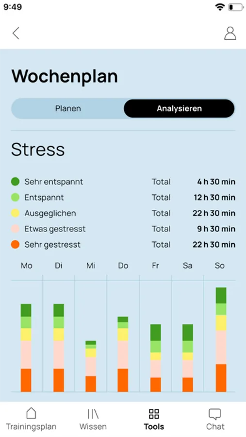 - Wochenplan: Er hilft dabei, Tage besser zu strukturieren und Pufferzeiten einzubauen. Dank der Analysefunktion lassen sich stressreiche Aktivitäten schneller erkennen, so dass diese bewusst verändert werden können und Dank entspannender Aktivitäten ein Ausgleich geschaffen werden kann.