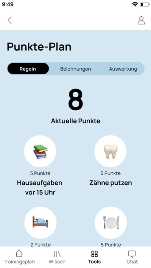 - Punkteplan: Mit dem Punkteplan können neue Gewohnheiten im Familienalltag etabliert werden. Es motiviert das Kind mit Belohnungen, sich an die gemeinsam aufgestellten Familienregeln zu halten.