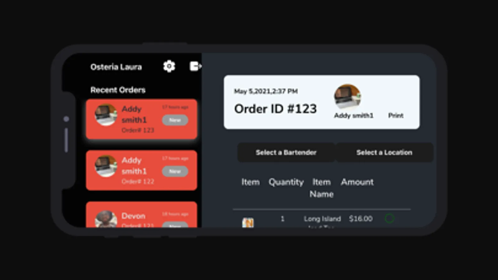 Each new order received will be listed in RED from top to bottom. Once an order is selected, your bar staff can select the bartender making the order and the location for pickup. Orders that have been placed that are out of stock can be cancelled. Once an order is accepted, customers will be notified of pickup location to receive their order.
