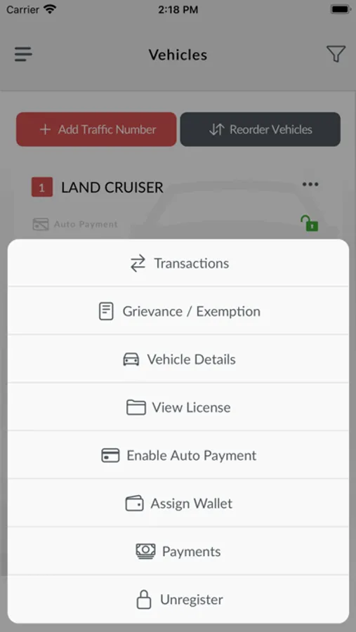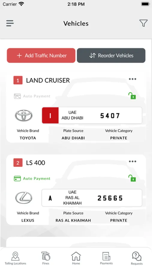 - خدمة تسجيل مركبات المستخدم في النظام من خلال استرجاع قائمة المركبات المرتبطة بالملف المروري الخاص به.