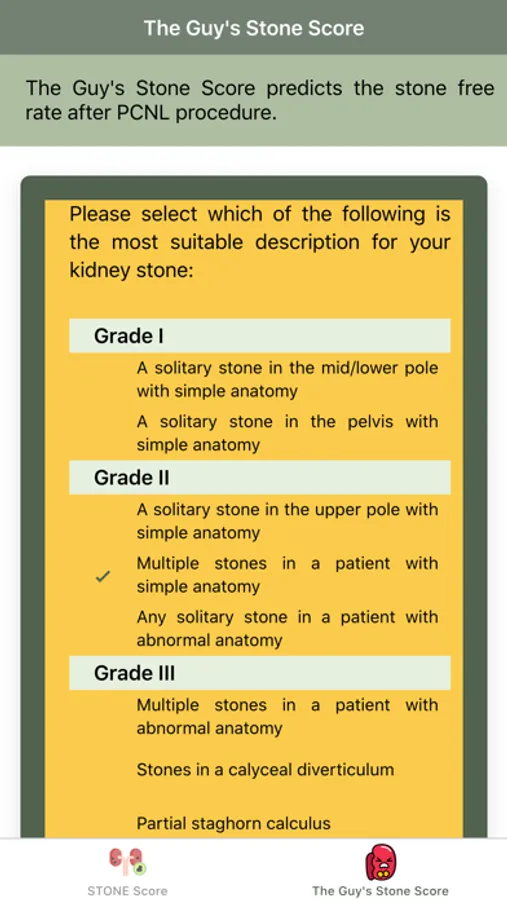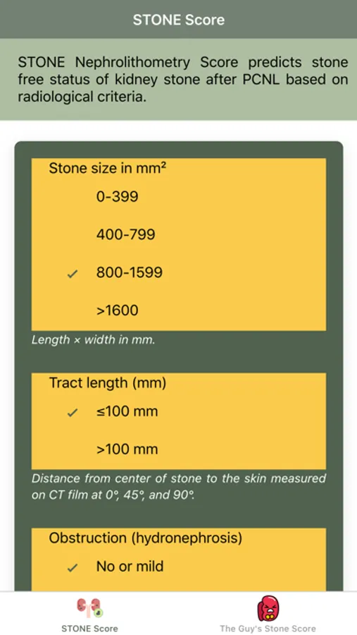 “Kidney Stone Scoring - Predicts SFR after PCNL” also calculates the Guy’s stone score. In Guy's score, the parameters included are a number of stones, the location of the stone (calyces involved), abnormal anatomy, the presence of partial or complete staghorn stones and spinal injury/bifida. However, it does not include stone size, which in itself is a major predictor of the success rate of PCNL.