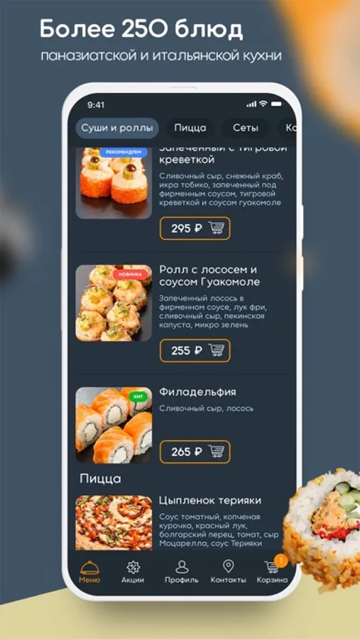 Меню состоит из разнообразных блюд: мясные и рыбные блюда, пицца, паста, вок, суши и роллы, салаты, десерты.