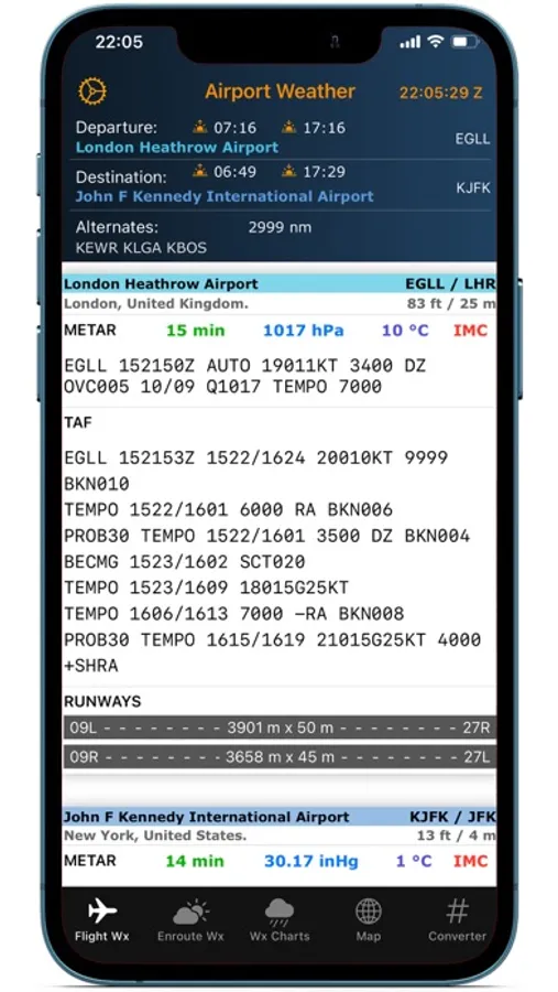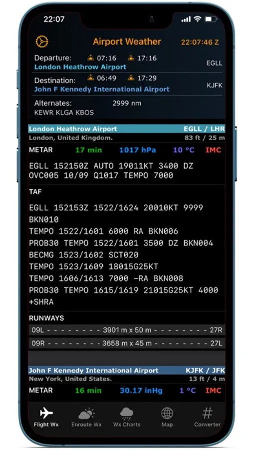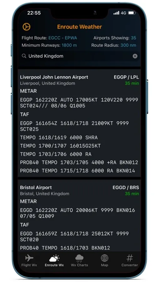 Enroute Weather Page - Downloads METAR and TAF for all Airports within 100nm of route between Departure and Destination Airports. Runway Length filter can be applied and range extended to 300nm either side of track.