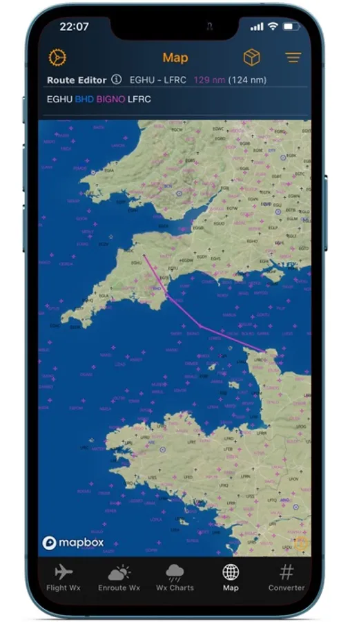 Map Page - Contains a World Map with all Airports, European Region contains Waypoints, VOR's and NDB's and can be downloaded in settings for offline use.