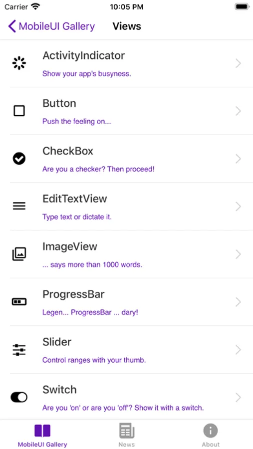 This app is a collection of widgets, layouts and UI components that are available to MobileUI developers. It is a showcase and reference for the MobileUI Framework and gives you direct access to the developer documentation of all presented components.