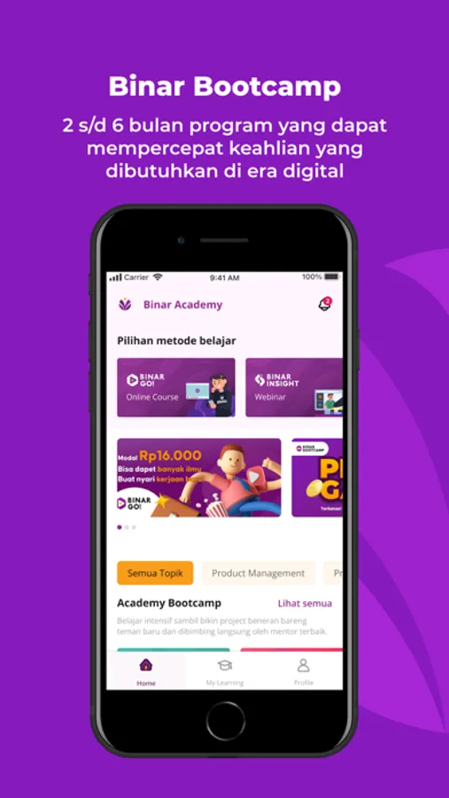 Mau belajar skill buat masuk industri digital dari dasar? Atau, upgrade skill kamu biar makin jago? Semuanya bisa di aplikasi Binar Academy!