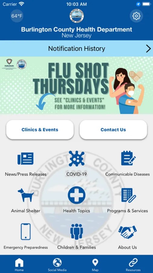 Burlington County NJ Department of Health provides this app as a resource for Burlington County citizens and businesses. Receive important alerts, and access information from the County’s Health Department: Clinics and events, Animal Shelter, Communicable Diseases, Emergency Preparedness, Children and Families, Health Topics, county health services and programs along with access to the health department’s social media.