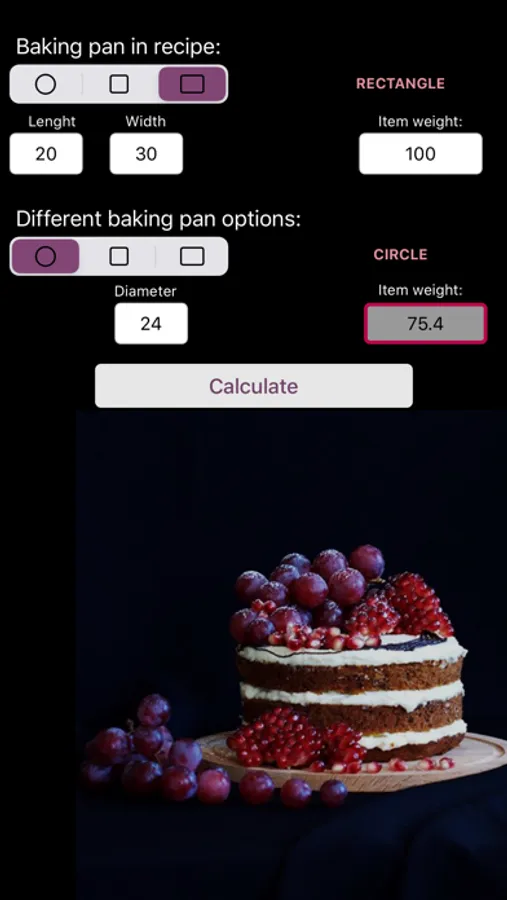 Cakes could have round, rectangular or square shapes. Recalculation performs from one shape to another.