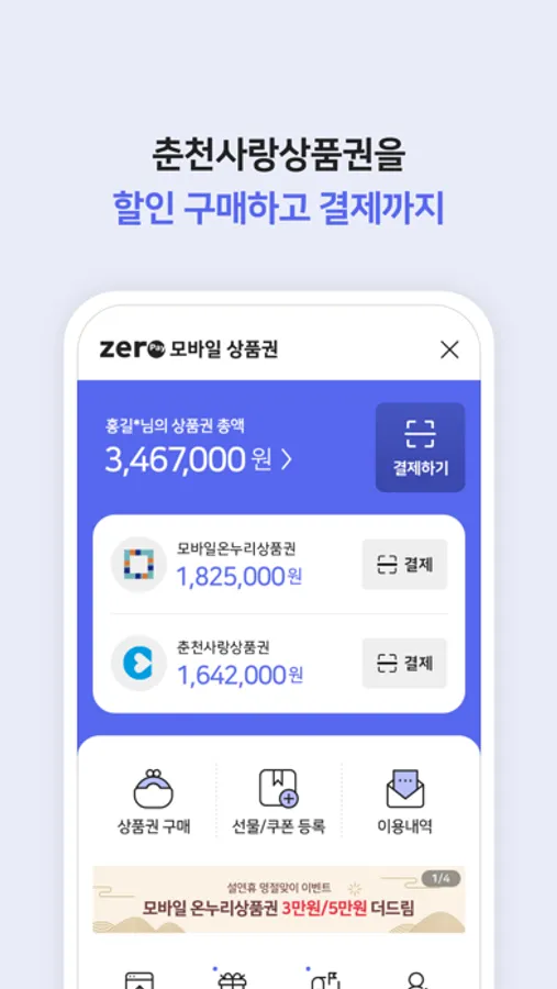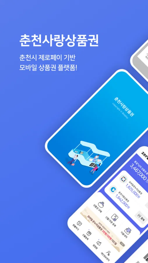 또한 본 앱 안에서 모바일 춘천사랑상품권 구매 및 결제, 제로페이 결제 기능까지 탑재하여 하나의 앱 안에서 다양한 기능과 사용 혜택을 누릴 수 있습니다.