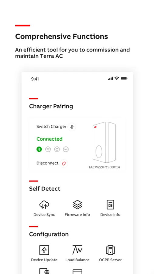 TerraConfig is a practical and efficient app for qualified electricians or engineers to commission, configure and maintain the ABB Terra AC wall box.