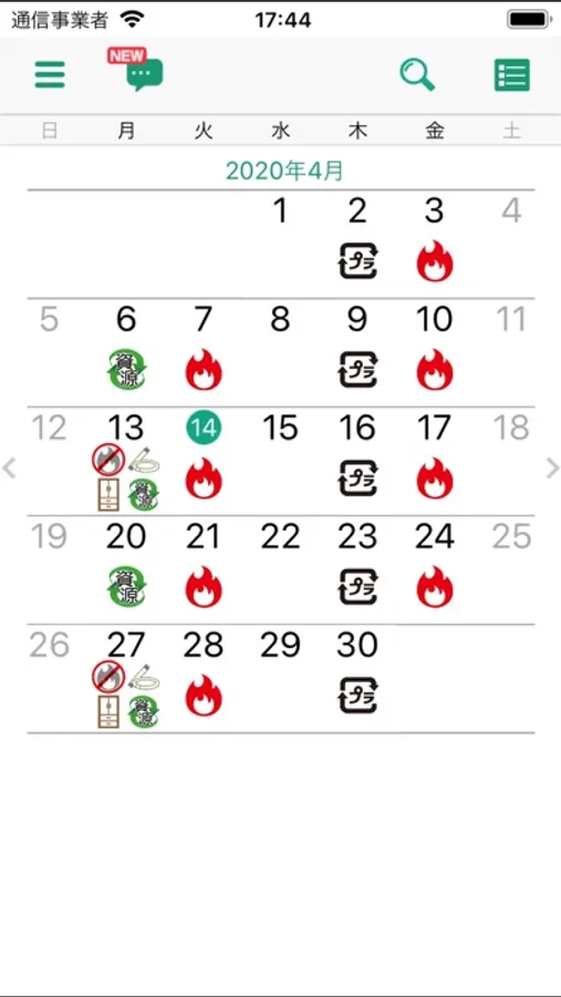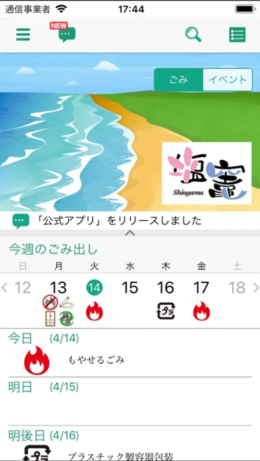 収集日変更のお知らせやイベント情報などを確認することができます。