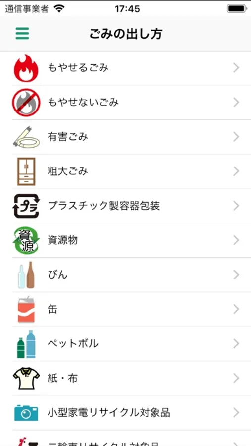 品目毎にごみの捨て方を確認できます。また、検索性の高い仕組みをつかっているため探しているモノを簡単に見つけることができます。