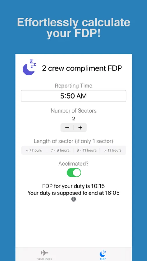 Flight Duty Period. Effortlessly calculate your 2 crew compliment FDP. The formula takes inputs that includes the following