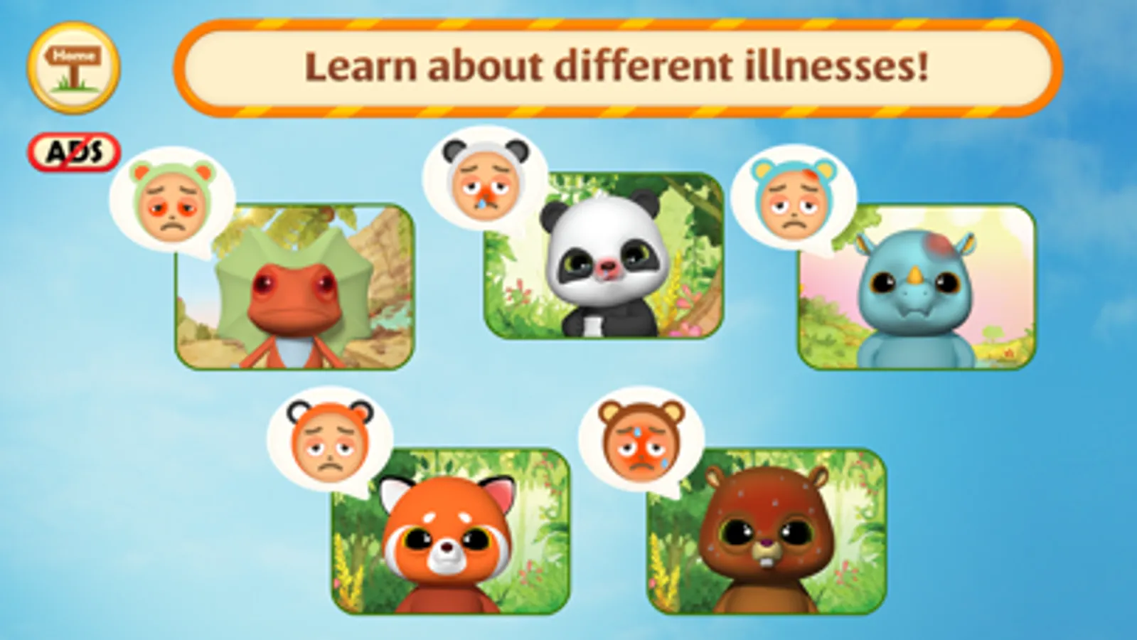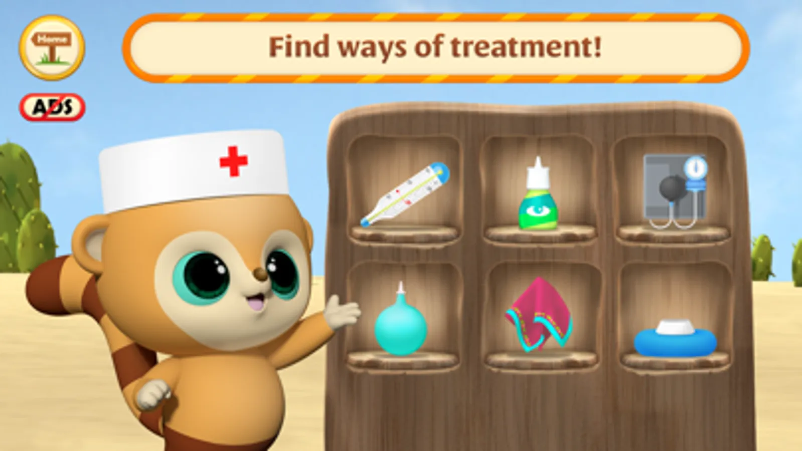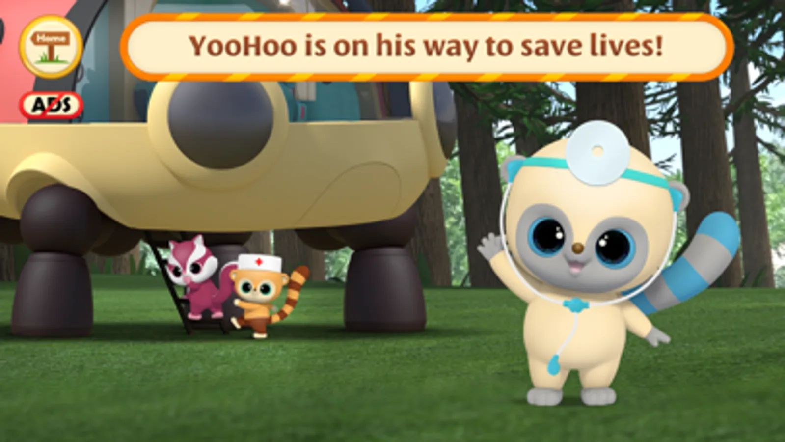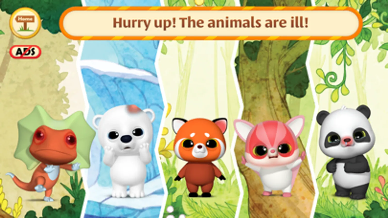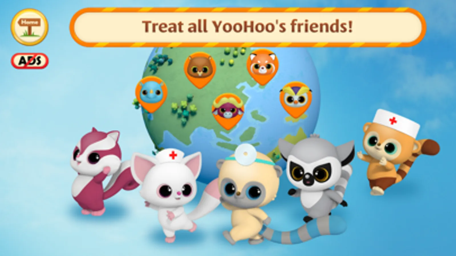 Hey! YooHoo and his friends speaking. Our neighbor animals got sick and we must help them! We won't make it without you, and that's why you must embark on a journey with us! You will be able to treat the most exotic animals from all around the world! There are 10 characters waiting for you, and they keep on getting different illnesses; there will also be 5 places where you can go together with YooHoo and his friends!