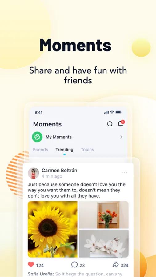 • Moments: Share your beatiful moments anytime, anywhere, and see what your friends are sharing.