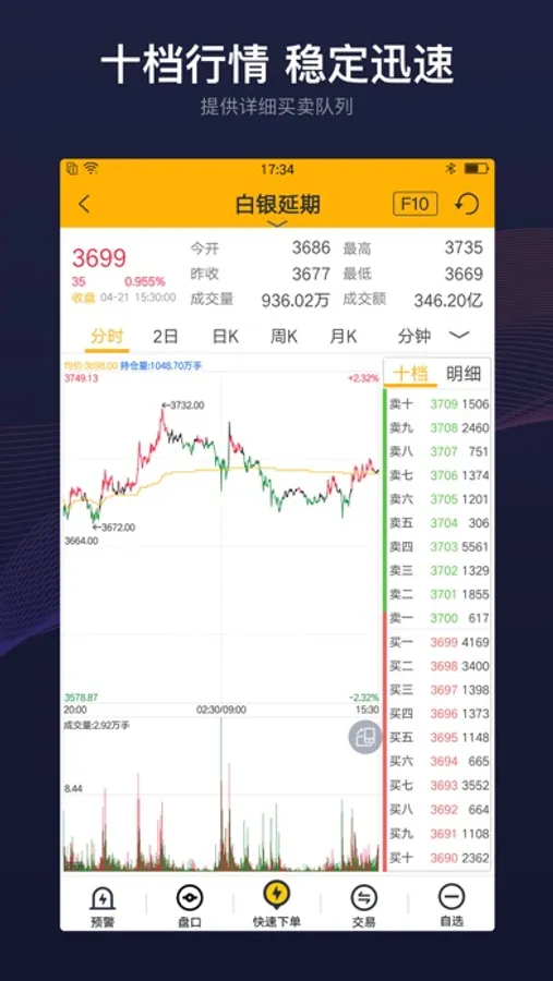 专业、流畅、稳定的行情信息,十档行情提供详细买卖队列,快人一步知晓价格走势。