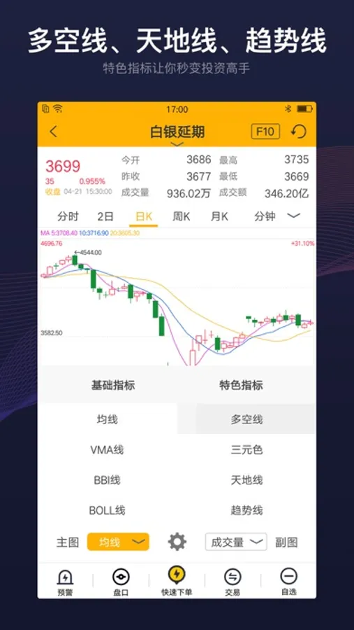 标准分时K线、分钟K线等任意时间K线数据,结合多空线、趋势线、准星线等特色指标,秒变投资高手。