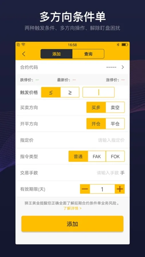 两种价格触发条件,满足条件自动委托,买卖、开平、多方向操作类型,解除盯盘困扰。