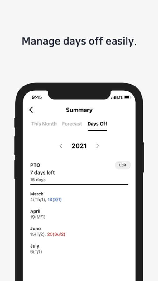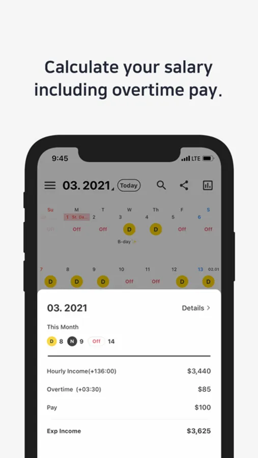 Check up on work-related informations such as weekly total work hours, income, vacation usage, etc.