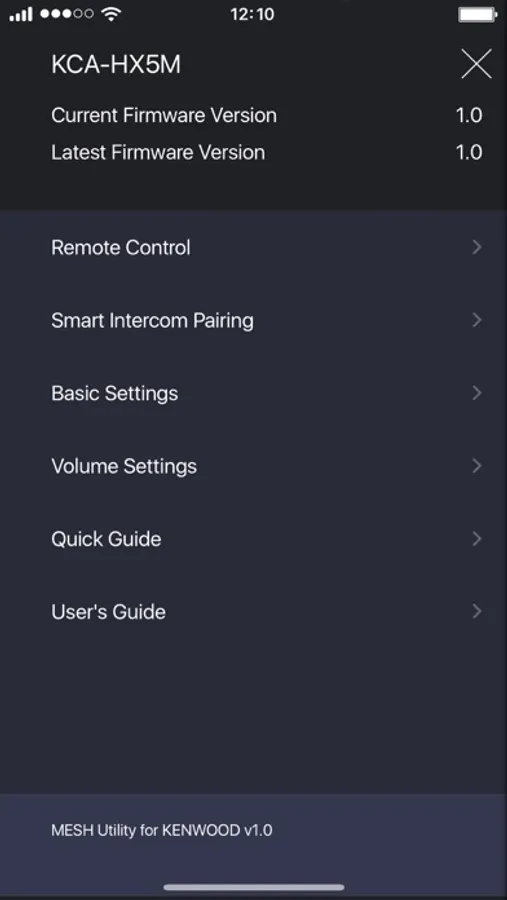 Take control of your Kenwood KCA-HX5M device from the palm of your hand with the convenient and easy to use MESH Utility App. The MESH Utility App allows riders to easily manage and navigate through the device’s settings straight from your smartphone. You can also simply turn the Mesh Intercom feature on and off, and change modes between Open, Group within the MESH Utility App.The MESH Utility App makes it simple to create a Mesh, quit or join a Mesh and even turn the mic on or off.