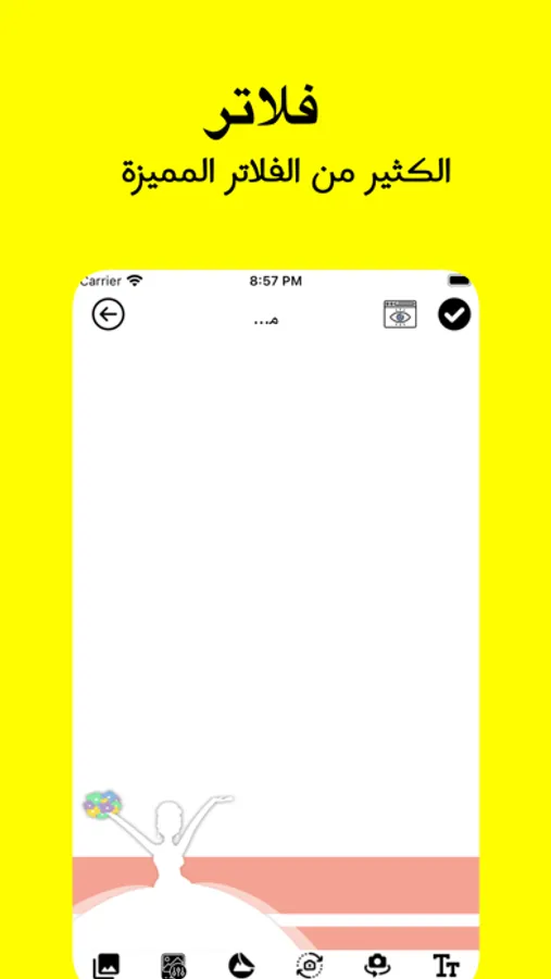 الكثير من الفلاتر المتوفرة في التطبيق مصممة بالقياس مطلوب مع امكانية كتابة عليها وتعديل او اضافة فلاتر او ملصقات او اضافة صورة من خلال الجهار ونحكم وقصصه بسهولة داخل التطبيق مع توفير تأثيرات جميلة داخل التطبيق لزيادة من جمالية التطبيق وتنزليها او مشاركتها .