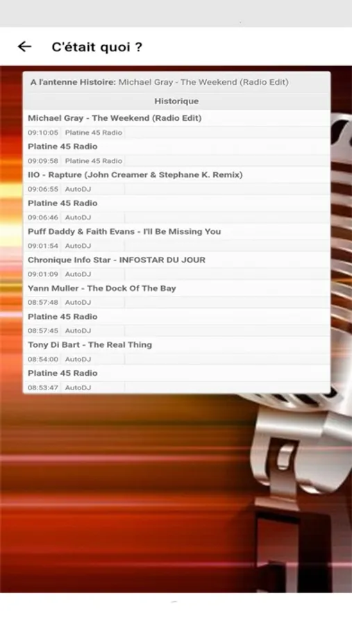 Platine 45 Radio diffuse essentiellement des hits des années 80, 90, 2000. Retrouvez ainsi des artistes qui ont marqué ces années. Tous vos plus beaux souvenirs. Écouter sans modération !