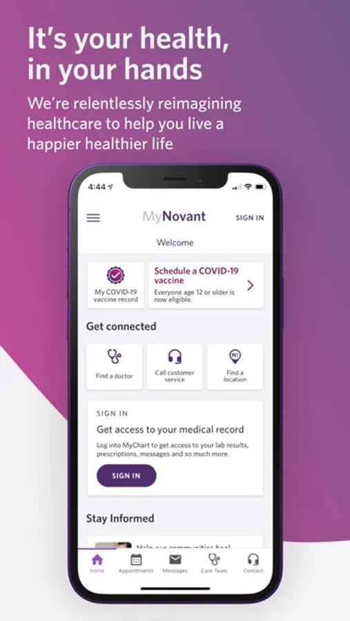 Stay connected and stay well with MyNovant. Take total control of your health and wellness. See test results as soon as they ‘re ready. Schedule everything from routine preventative care to a visit with one of our many specialists. Find an urgent care location near you right now. Stay safe at home with a video visit. Send a direct message right to your doctor. It’s the App that puts our health experts and your own health directly into your hands. Novant Health makes it easier than ever to organize and access your important health information with you preferred health data applications. Connect to your Health app with Track My Health and send wellness information directly to your doctor.